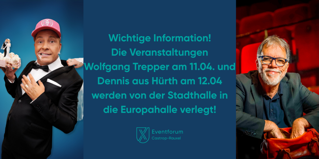 Wichtige Information: Die kommenden Veranstaltungen "Dennis aus Hürth am 12.04" und "Wolfgang Trepper am 11.4" werden von der Stadthalle in die Europahalle verlegt. Die Gebäude liegen nebeneinander. Der gleiche Parkplatz kann genutzt werden. Bitte nutzen sie den Eingang "Europahalle".